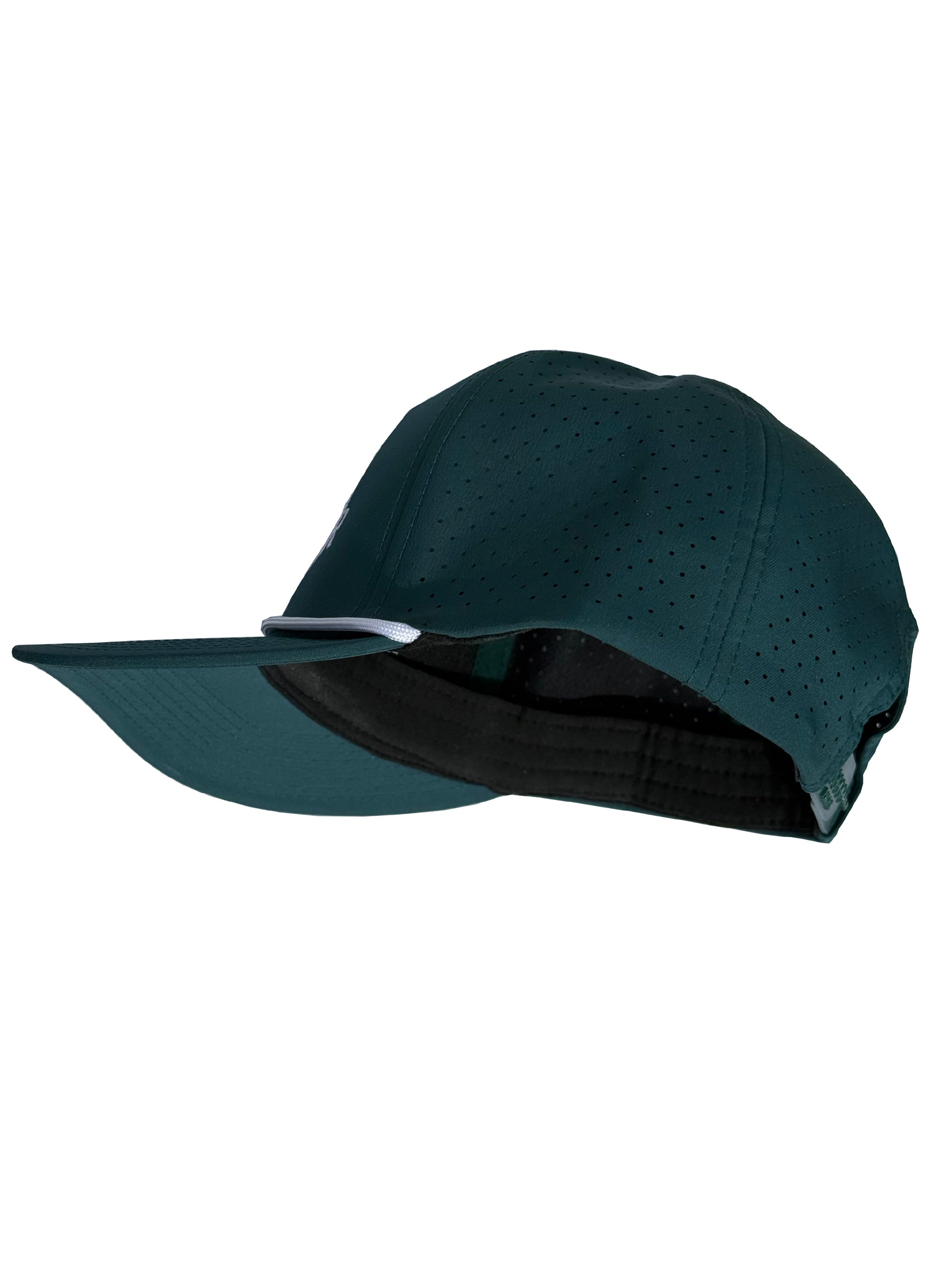 Performance polyester/spandex woven, Perforated panels, Adjustable snapback closure, One size fits most, Contrasting cord rope.